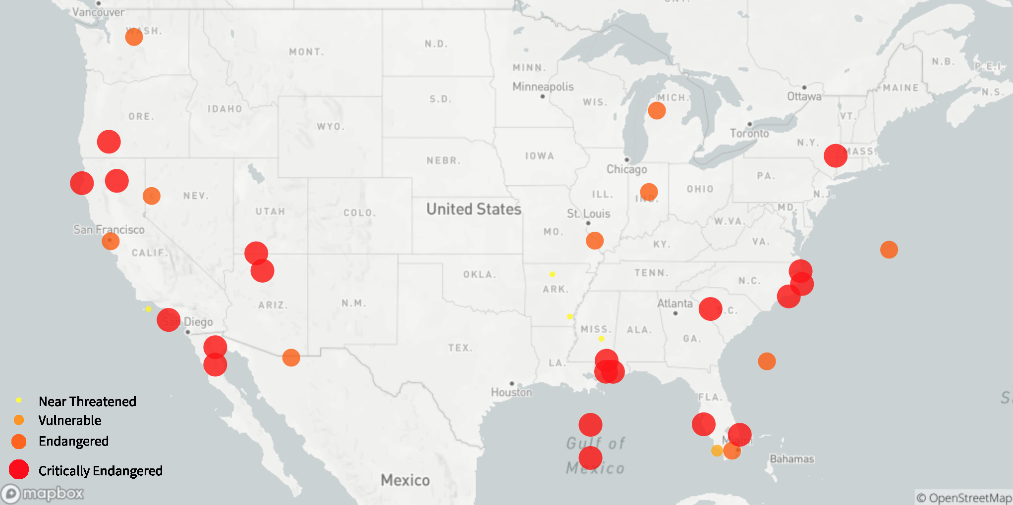 The weird view of hunting, along with changes in land use due to agriculture and development create severe risks for wildlife. The figure shows the circles that indicate the number to threatened wildlife in the US. Ok, I live in the worst state – Florida (or Floriduh). But there are risks all over. Some are trying to help. The St Vincent National Wildlife Refuge in North Carolina is the last stand for the red wolf. Colorado voted to introduce wolves to the state (they are already there but in tiny numbers).
